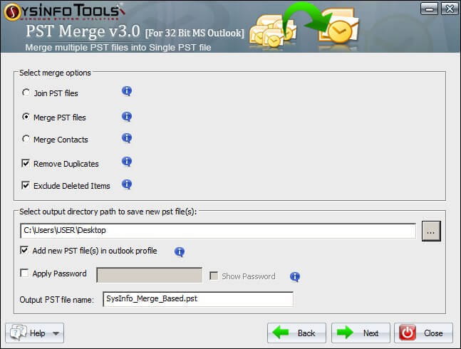Step 2: After you have opened the PST files; you will get different options to start with the merging process. Choose any of the option to merge PST, Join PST, and Merge Contacts. Let Exclude deleted items and duplicate item to be checked if want to perform the action. The tool also gives you an option to apply password on the merge PST file.
